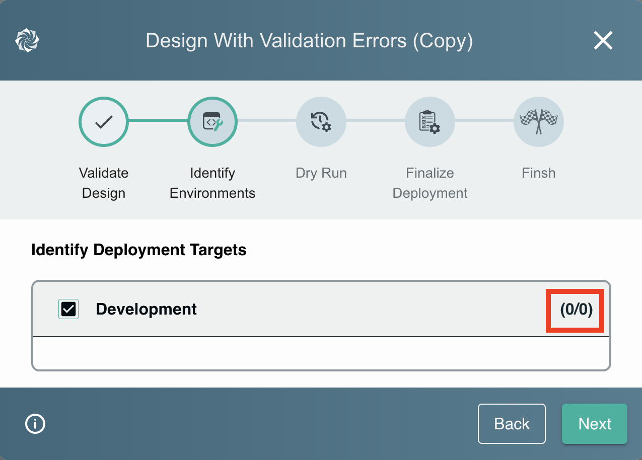 If your design fails validation checks, the modal will indicate the number of errors detected. Each error will provide specific information about the component or annotation that caused the failure. Use this detailed feedback to identify and correct the issues in your design before proceeding with the deployment.